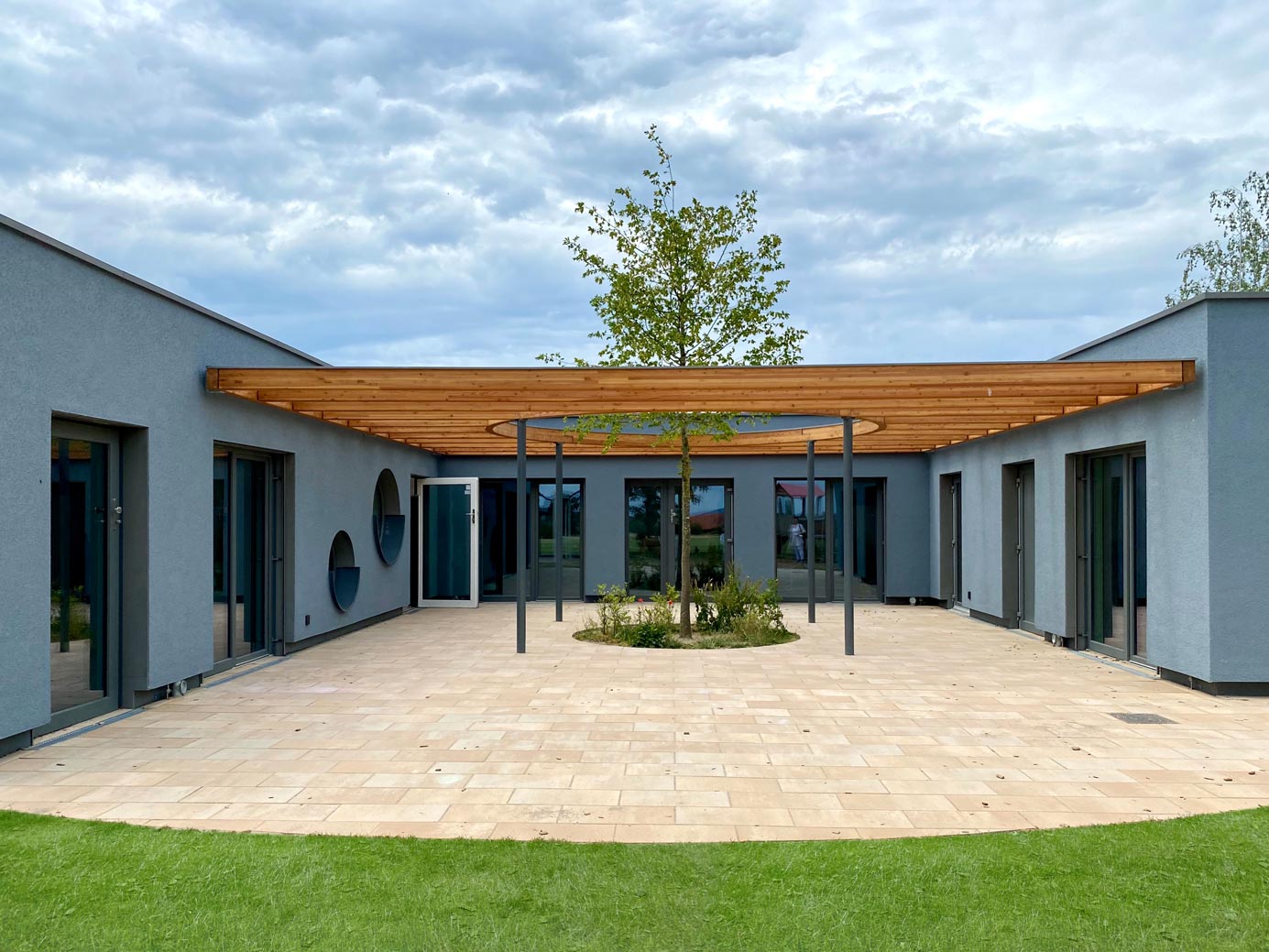 Im Herzen des Gebäudes ist zwischen Kindergarten und Krippe die Mensa platziert, in der die Kinder die Möglichkeit haben sich selbständig am Büffet zu bedienen. Aus der Mensa blickt man in den Innenhof, der die beiden Gebäudeflügel der Einrichtung mit einer großzügigen Pergola aneinanderbindet. Von hier aus kann man weit in die landwirtschaftlich bewirtschaftete Umgebung schauen, sodass die Kindertagesstätte regelrecht im ‚Grünen‘ steht und der Wechsel der Jahreszeiten direkt zu ‚begreifen‘ ist.