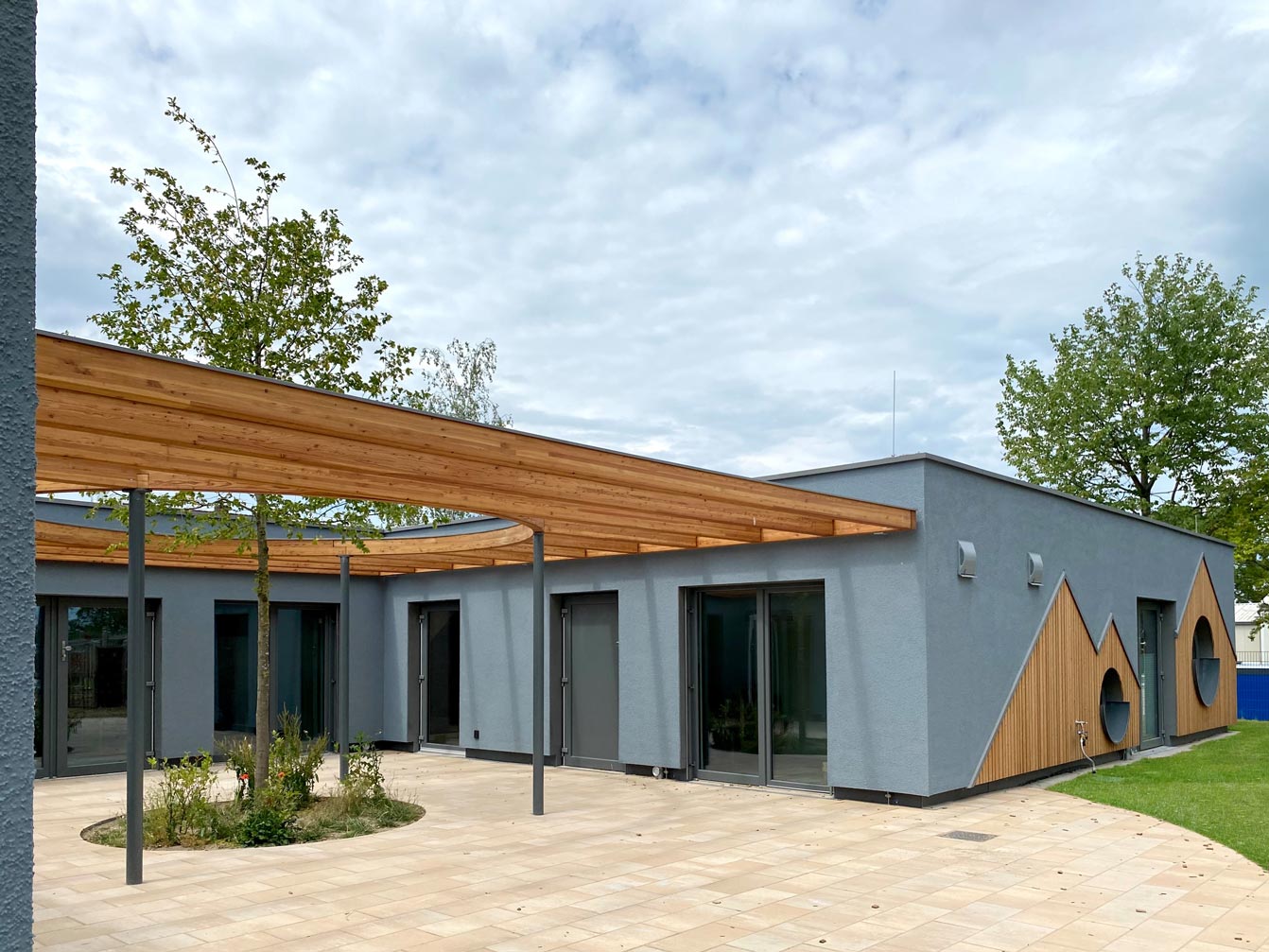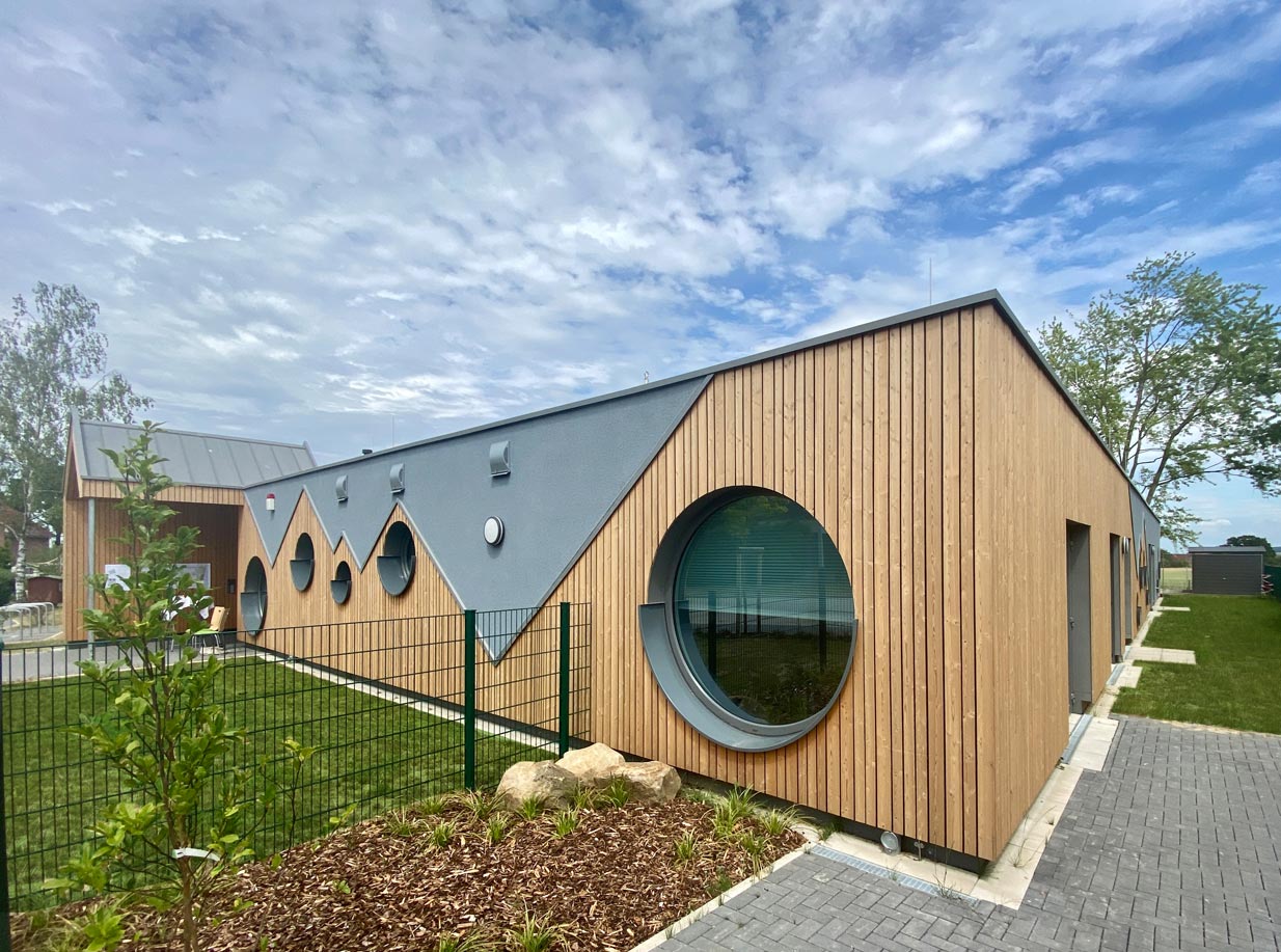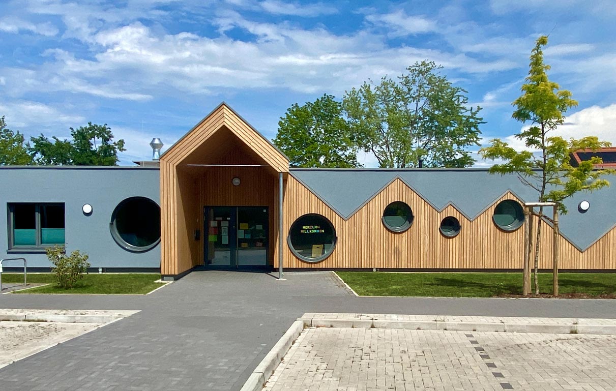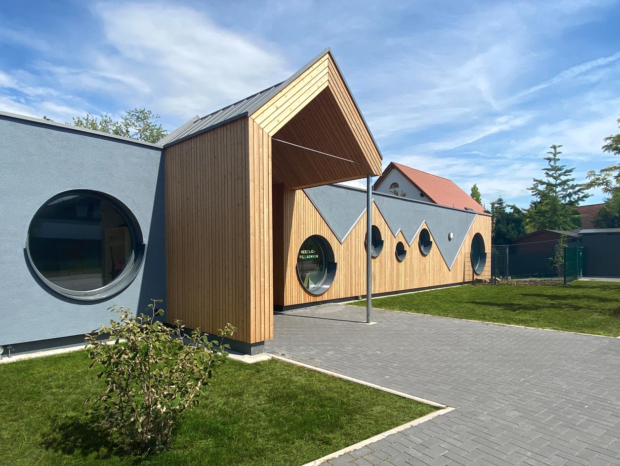 Um dem Kindergarten auch von außen einen spielerischen Ausdruck zu verleihen, und die aus wirtschaftlichen Gründen kompakt gehaltene Form der Kita aufzulockern, wurden abstrahierte ‚Dachformen‘ in Holzverschalung auf die Fassade aufgebracht und durch runde Fenster auf Kinderhöhe ergänzt.