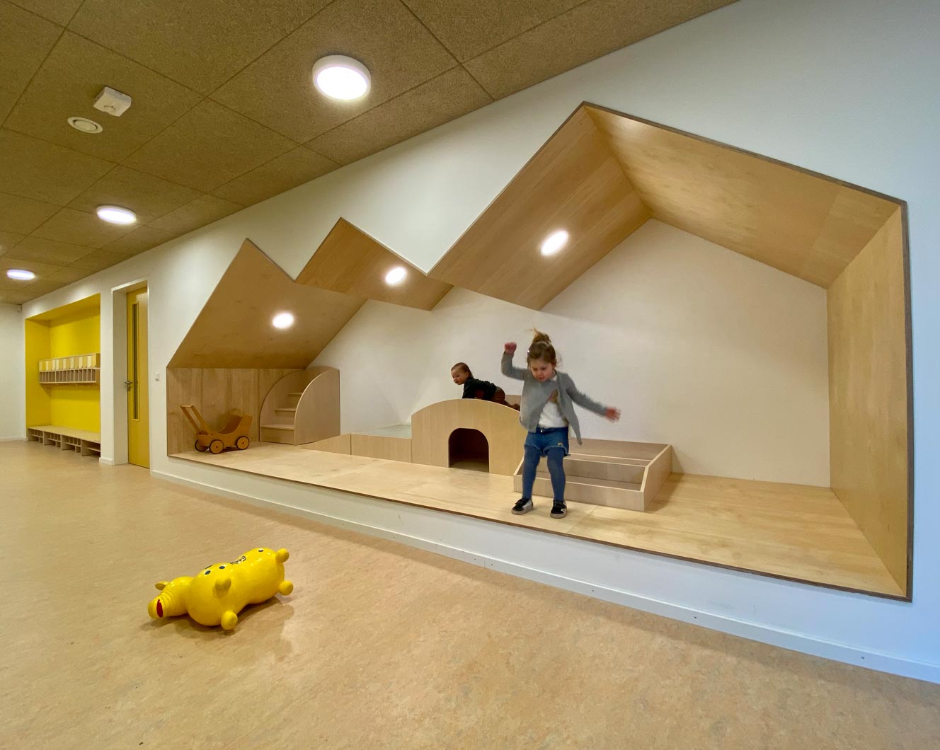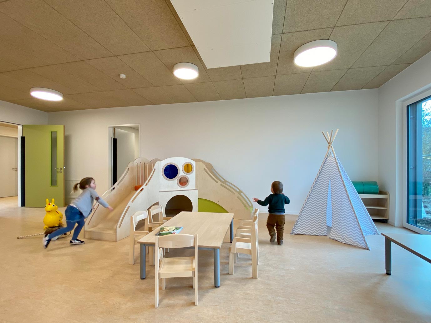 Im Innenraum wurden durchweg warme, natürlich anmutende Materialien verwendet um eine Atmosphäre zu schaffen welche sich positiv auf die frühkindliche Entwicklung auswirkt.